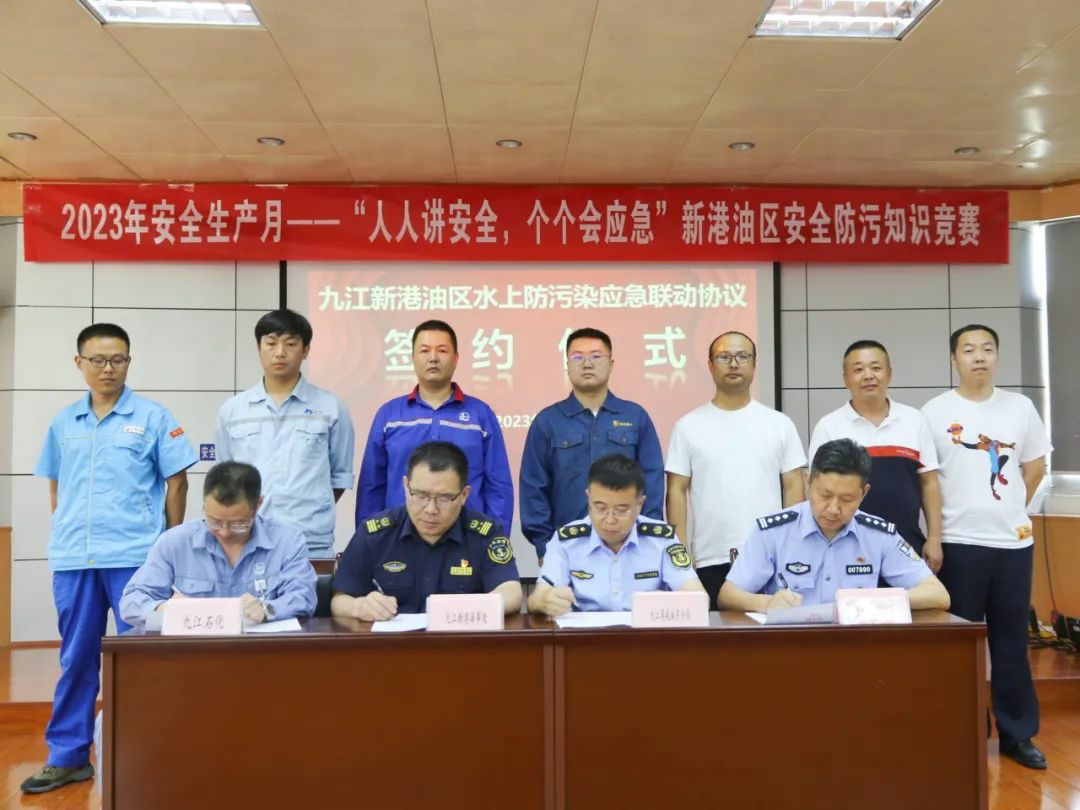 中国石油化工股份有限公司九江教培中心、九江海事局新港海事处、九江市港口航运管理局城东港区分局、九江长航公安消防支队、新港油区各危险品码头单位以及社会服务公司共同签署九江新港油区水上防污染应急联动协议,全面整合油区防污染应急力量,建立统一、完善的指挥体系,通过联防共建,建立协作机制,进一步提升油区水上环境安全风险防范和防污染应急反应能力,形成有效合力,助力长江绿色经济高质量发展。