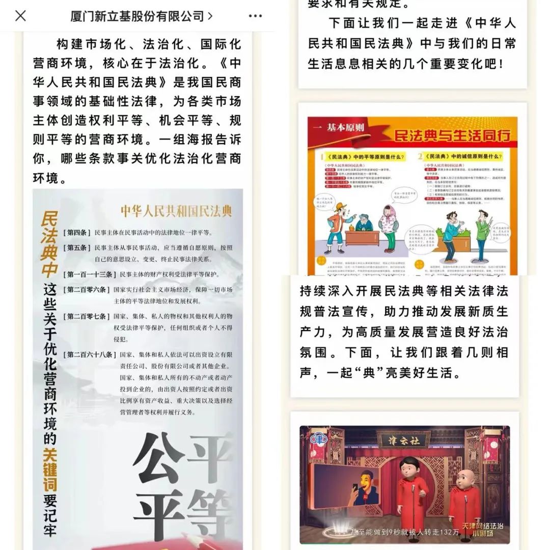 厦门本部利用企业公众号就民法典有关内容进行宣传,通过民法典宣传漫画,日常生活热点的AI诈骗、直播捞金网络法治相声小剧场等普法视频等形式,让民法典宣传内容通俗易懂、趣味横生。