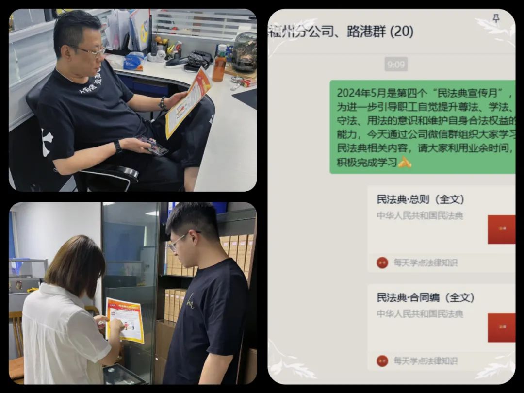 福州分公司(路港公司)向干部职工发放民法典知识宣传单,重点介绍侵权责任篇和物权篇在生活中的应用,并通过公司微信群组织大家学习民法典总则及合同篇相关内容,带动全体干部职工潜移默化地吸收法律常识。