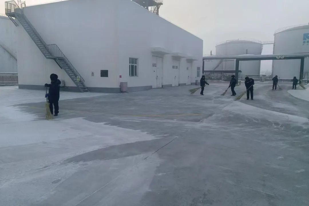 春节期间,西北大区新疆新立基迎来了低温降雪天气,为保障库区及周边道路的安全畅通,公司迅速组织员工开展扫雪除冰工作。在零下的寒风中,他们身披大衣、手持工具,不顾寒冷清理积雪,确保装卸车通道、锅炉房和操作间的路面无积冰,设备无隐患,保障库区生产作业正常进行。