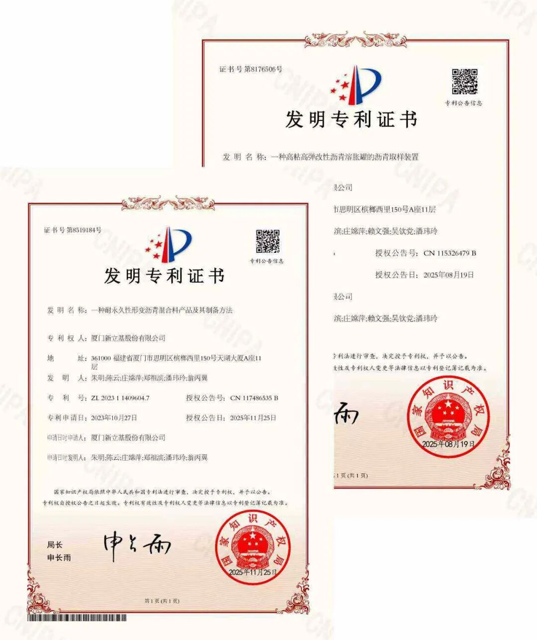 2025年388vip太阳集团两项发明专利“一种高粘高弹改性沥青溶胀罐的沥青取样装置”和“一种耐永久性形变沥青混合料产品及其制备方法”获国家知识产权局授权,正是公司综合实力和自主创新能力的体现,同时也为公司的发展再添动力。