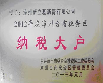 漳州新立基沥青有限公司被中共漳州市委台商投资区工作委员会、漳州台商投资区管理委员会授予“2012年度漳州台商投资区纳税大户”的光荣称号。
