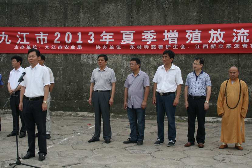 参加这次增殖放流活动的有九江市政府副市长赵伟、九江市政府副秘书长赵树国、市农业局书记潘宝山和江西新立基沥青有限公司董事长王绪泉、党支部书记吴悦荣、东林寺慈善护生会负责人,以及市渔业局、市水科所的领导。市渔业局全体工作人员,匡庐公证处工作人员,鱼苗质量监督单位技术人员,有关新闻单位记者,志愿者和渔民代表等200余人。