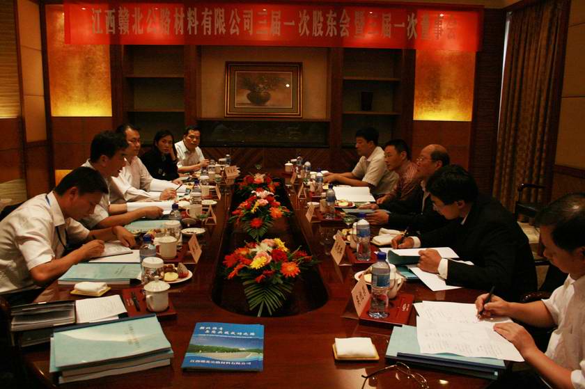江西赣北公路材料有限公司三届一次股东会暨三届一次董事会、一届一次监事会于2010年9月26日在九江市远洲国际大酒店召开。股东会由第一大股东法人代表陈云臣先生主持。股东会审议通过了:股权变更的议案;变更公司类型的议案;终止原公司合同、章程,制定新的公司章程的议案。