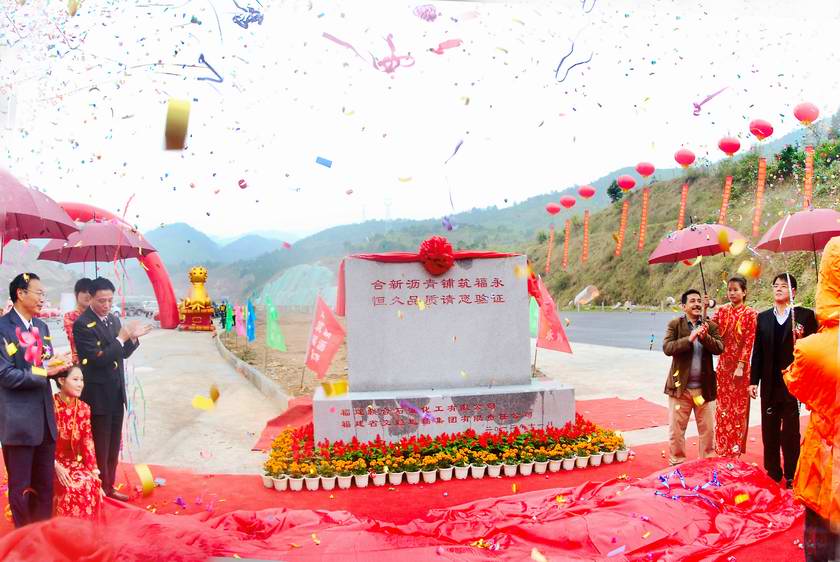 11月28日上午,福永高速方广岩隧道口,彩旗飘飘,鼓乐齐鸣,由福建联合石油化工有限公司、福建省交通运输集团有限责任公司主办,福建省交通建设投资有限公司所属388vip太阳集团有限公司承办的“合新”沥青铺筑福永庆典活动在这里隆重举行!60个空飘汽球,数百盆的鲜花,把整个会场装饰得喜庆热烈。庆典的舞台座落在方广岩风景秀丽的山峰下,舞台正中是一幅绘有联合石化厂区、交通集团沥青储罐及四通八达高速公路网的巨幅画面,上面“‘合新’沥青铺筑福永庆典”十个大字熠熠闪光。舞台的前方矗立着一块用红绸布遮着的石碑。