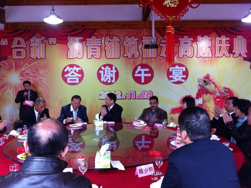 中午12时,“合新”沥青铺筑福永庆典活动答谢宴会咋福州龙泉山庄举行。宾主双方围坐在一起,共同回忆,共同展望,大家频频举杯,为共创“合新”品牌,铺筑美好未来干杯!