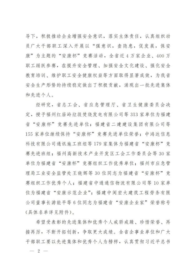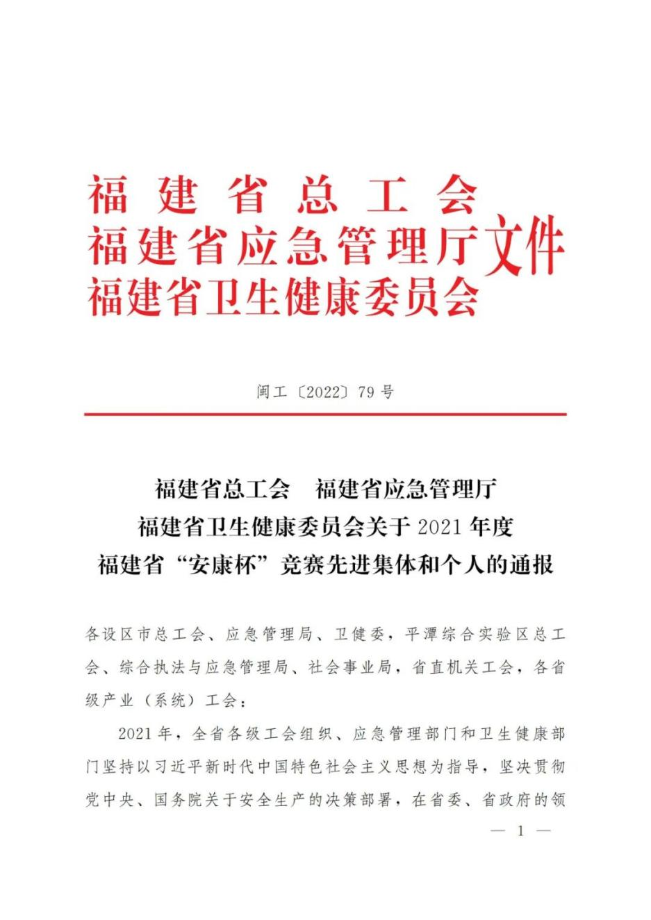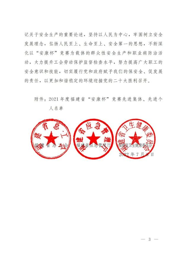 近日,福建省总工会、福建省应急管理厅、福建省卫生健康委员会联合印发《关于2021年度福建省“安康杯”竞赛先进集体和个人的通报》,388vip太阳集团荣获福建省“安康杯”竞赛先进单位荣誉。