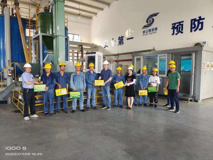 7月28日下午,公司党委副书记、纪委书记吴悦荣到泉州新立基开展“防暑降温送清凉”慰问,公司总经理助理、泉州新立基总经理陈育生陪同慰问。他们向库区一线员工送上“防暑降温送清凉”的慰问物资,随后实地查看了改性生产车间,SBS仓库,锅炉房等重要区域,详细了解生产设备及改性装车台的使用情况。嘱咐大家要做好劳动保护,注意炎热天气的防疲劳和防中暑,合理安排工作时间,轮换作业,切实做好防暑,防晒工作,保障员工身心健康。