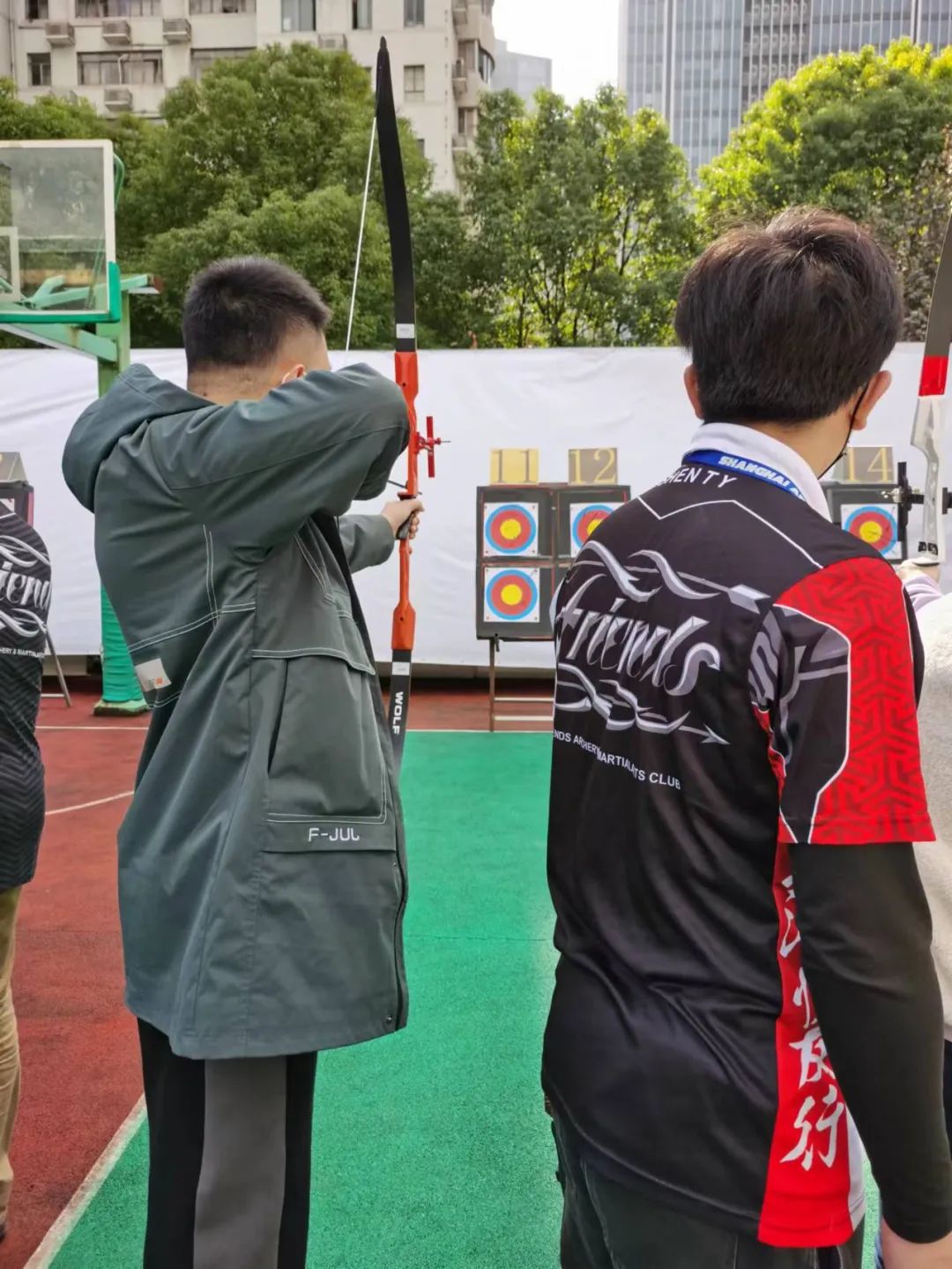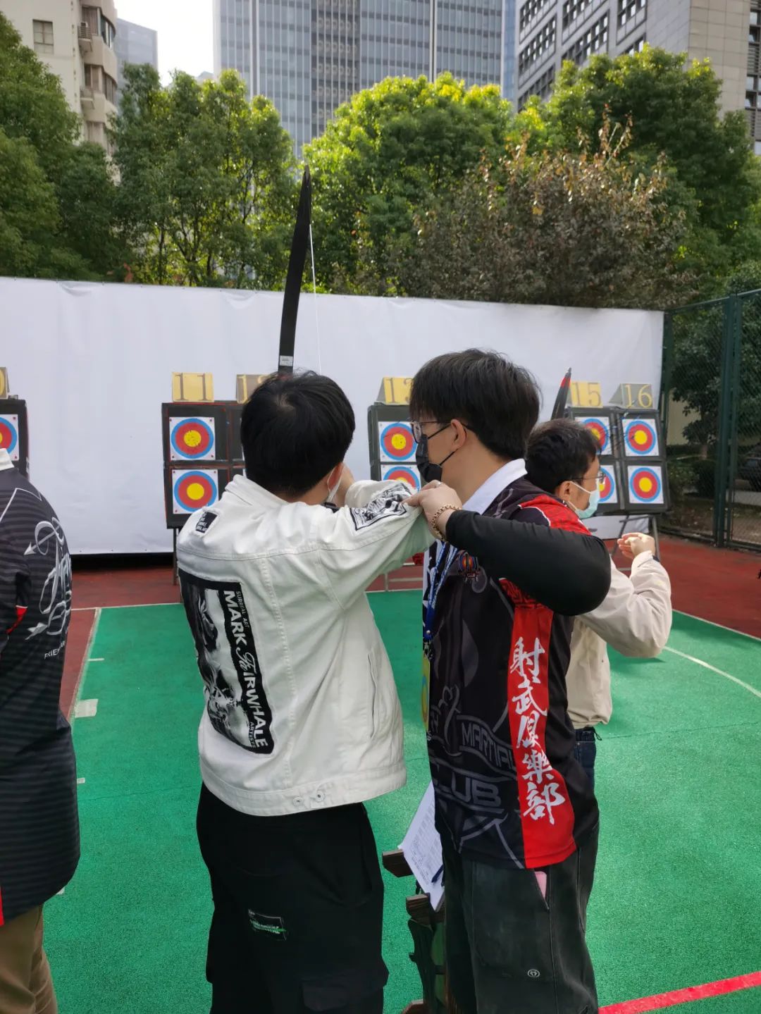 射箭作为中华传统“六艺”之一的文体项目,近几年悄然兴起,区别于跑跳等激烈运动,射箭更需参与者沉着专注、端正心态。第一次拿起专业弓箭,方知看似容易做实难。参赛队员在职业教练的指导下进行赛前训练。现场专业教练向参赛的队员们耐心地告知瞄准要领,悉心地调整队员的拉弓姿势,经过初步训练和两轮模拟赛之后,比赛正式开始。三名队员目光如炬、聚精会神;全神贯注、奋力拼搏。搭箭、扣弦、预拉、开弓、瞄准、撒放,他们仿佛穿越到了古代,成为了赛场上的勇士,为了集体的荣誉,在比赛中都射出了较满意的环数,享受到了从箭矢搭弓到箭头射入标靶所带来的乐趣。