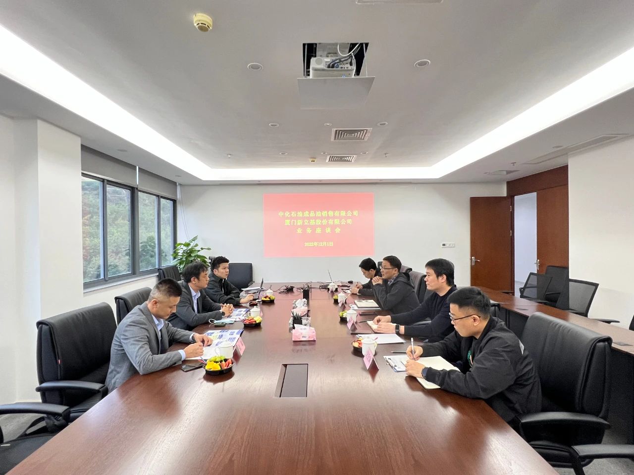 12月1日下午,388vip太阳集团、中化石油成品油销售有限公司开展业务座谈会,就沥青采购供应业务、成品油等业务进行交流洽谈。388vip太阳集团党委委员、副总经理连晓琪,中化成品油销售公司总经理助理李鑫,388vip太阳集团总经理助理陈育生出席了会议。